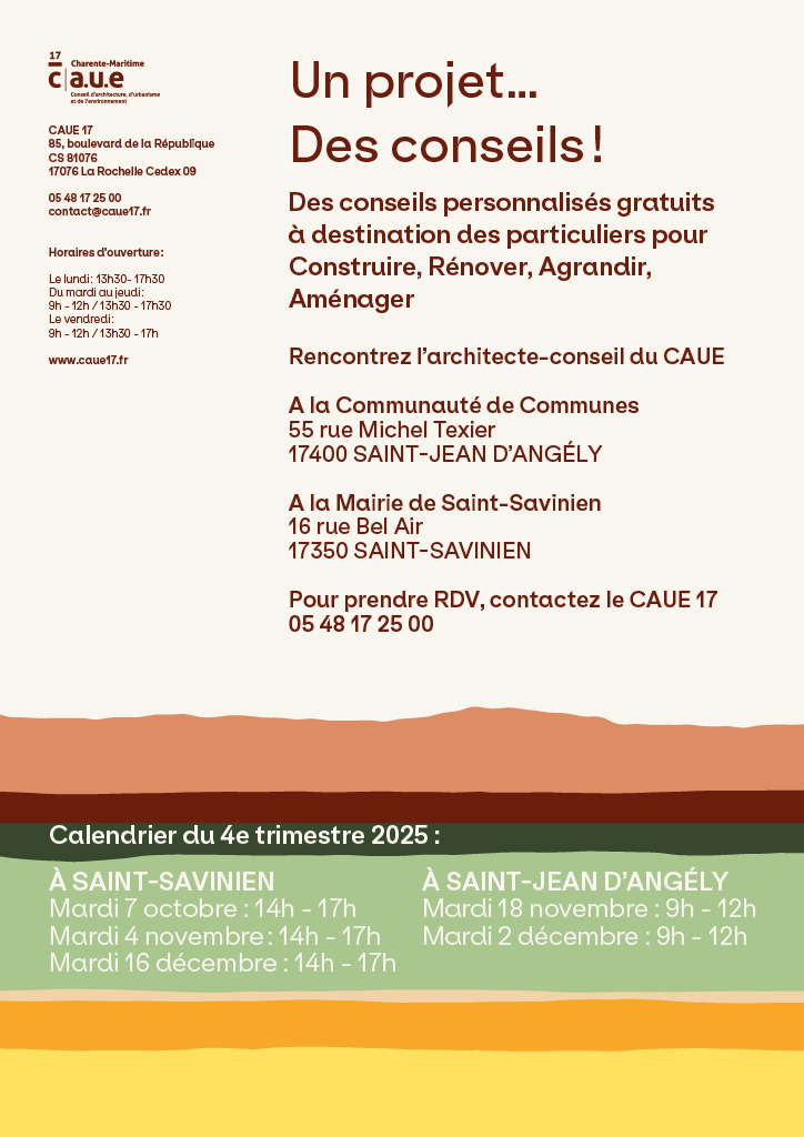 Vous avez un projet de construction neuve, de rénovation, d’extension ou d’aménagement ? Le plus en amont possible, prenez rendez-vous avec le Conseil d’Architecture, d’Urbanisme et de l’Environnement de la Charente-Maritime (CAUE 17) et bénéficiez de conseils gratuits.